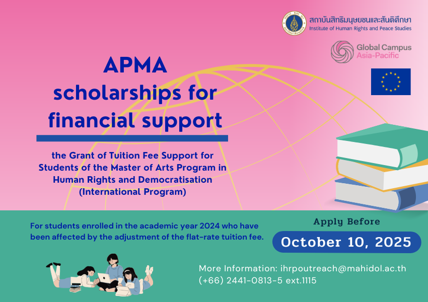 Institute of Human Rights and Peace Studies Post Grad Program Research/Academic Services Journal HRPS Highlight Highlight Peace Festival Week 2025: Human Rights, Security, and Pathways to Peace July 18, 2025 Activities Call for Papers : International Hybrid Conference on responding to a world in disorder: Emerging research in rights, politics and sustainable development May 17, 2025 Highlight CALL FOR APPLICATIONS : APMA Program 2025 ROUND 2 – PARTIAL SCHOLARSHIP OFFER April 4, 2025 Highlight Phd Call for Admission 2025 February 19, 2025 Latest News /activity Facebook Twitter Youtube View All News Announcement on the Grant of Tuition Fee Support for Students of the Master of Arts Program in Human Rights and Democratisation (International Program) October 4, 2025 Read More International Hybrid Conference on”Responding to a World in Disorder: Emerging Research in Rights, Politics and Sustainable Development” July 25, 2025 Read More Peace Festival Week 2025: Human Rights, Security, and Pathways to Peace July 18, 2025 Read More IHRP Staff Unite to Drive Strategic Direction for Institutional Development June 23, 2025 Read More Assistant Professor Dr. Padtheera Narkurairattana, Invited as a Research Advisor for Students in the Executive Program on Human Rights (Basic Level) June 10, 2025 Read More Mahidol University’s Social Sciences Network Organizes Seminar on “Higher Education and the Creation of Opportunities for Education and Learning toward Sustainable Development” June 10, 2025 Read More Page1 Page2 Page3 Page4 Page5 View All News Upcoming events View Past Events Activities in 2023 Join Our Paid Internship Program at International Labour Organization Bangkok 2024 November 22, 2023 Previous slide Next slide Link