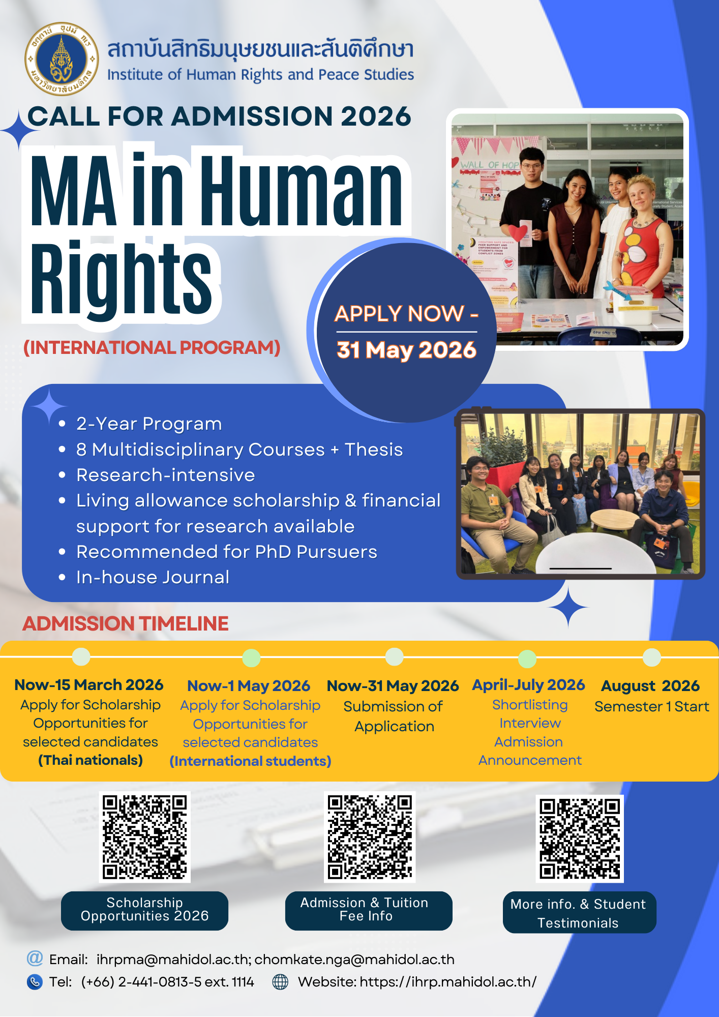 Institute of Human Rights and Peace Studies Post Grad Program Research/Academic Services Journal HRPS Highlight Highlight Call for Applications 2026 : Master of Arts in Human Rights (International Program) December 17, 2025 Highlight Call for Applications 2026 : PhD Program in Human Rights and Peace Studies (International Program) November 17, 2025 Highlight Call for Applications 2026 : Master of Arts in Human Rights and Peace Studies (Special Program) November 13, 2025 Highlight Call for Applications APMA 2026 : ALL FOR APPLICATIONS (FULL/PARTIAL SCHOLARSHIPS AVAILABLE!) November 12, 2025 Latest News /activity Facebook Twitter Youtube View All News Call for Applications 2026 : Master of Arts in Human Rights (International Program) December 17, 2025 Read More AUN-HRE Webinar Part 1 on Human Rights, Social Justice, and Peace ! November 28, 2025 Read More IHRP Mahidol and Yala City Announce Commitment to Becoming a “Human Rights City,” Advancing an Inclusive Urban Model for All. November 24, 2025 Read More JOB VACANCY : Lecturer 1 Position, Deadline 28 November 2025 November 20, 2025 Read More Call for Applications 2026 : PhD Program in Human Rights and Peace Studies (International Program) November 17, 2025 Read More Call for Applications 2026 : Master of Arts in Human Rights and Peace Studies (Special Program) November 13, 2025 Read More Page1 Page2 Page3 Page4 Page5 View All News Upcoming events View Past Events Activities in 2023 Join Our Paid Internship Program at International Labour Organization Bangkok 2024 November 22, 2023 Link