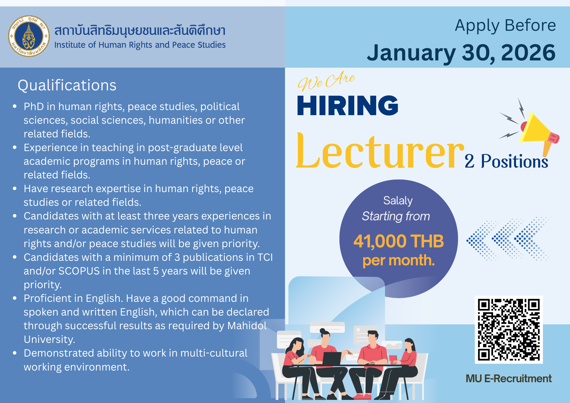 Job Description Position: Foreign Expert Unit: Institute of Human Rights and Peace Studies (IHRP) Responsibilities and Job description: Application documents: Examination Process: Consider from Application documents, academic presentation and interview Salary: 33,770 (+ 8,000) Baht per month (for Foreign Expert with PhD. Qualification) Application Apply Before January 30, 2026 Please submit an application form […]