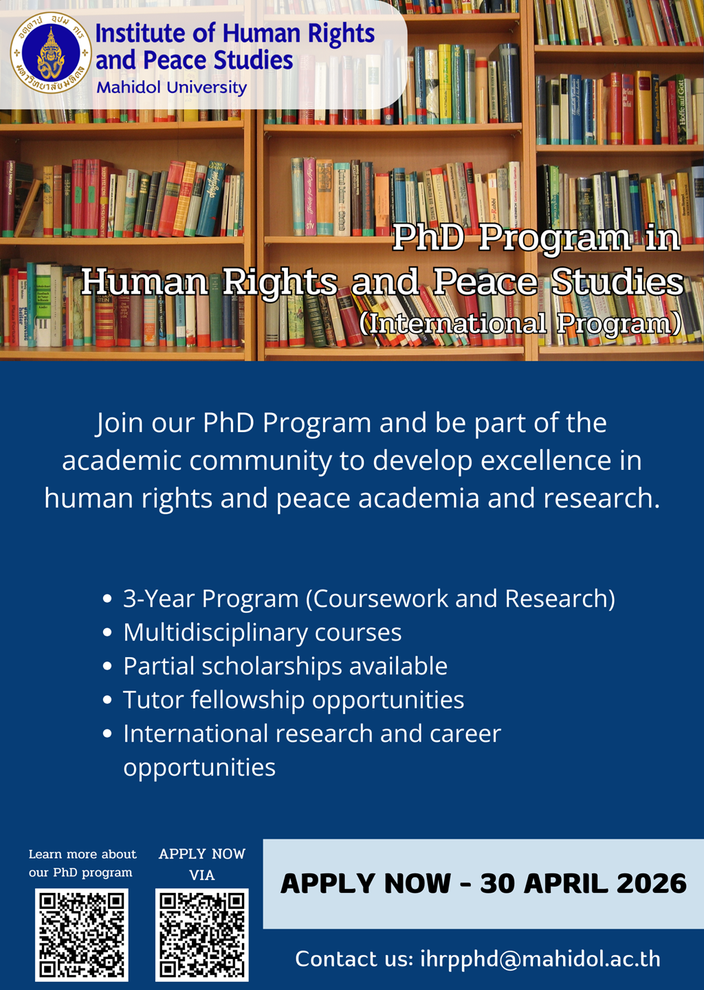 Call for Applications 2026 : PhD Program in Human Rights and Peace Studies (International Program)