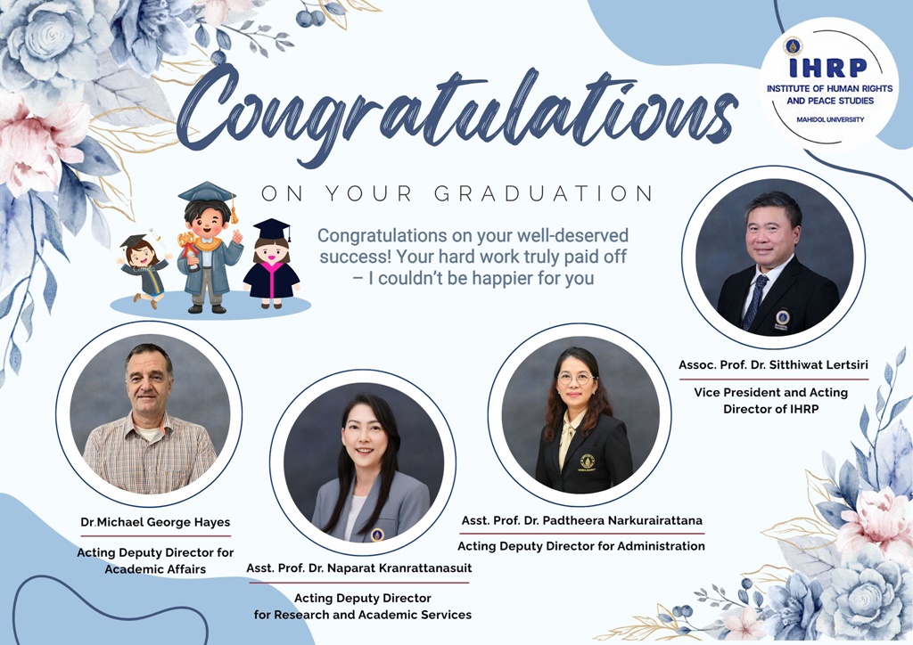 วันที่ 4 สิงหาคม 2565 ดร.วัชรฤทัย บุญธินันท์ ผู้อำนวยการสถาบันสิทธิมนุษยชนและสันติศึกษา มหาวิทยาลัยมหิดล กล่าวต้อนรับคณะอาจารย์และนักศึกษาจาก Ho Chi Minh City University of Law จำนวน 20 คน ในการเข้าเยี่ยมชมสถาบันฯ และแลกเปลี่ยนเรียนรู้ประสบการณ์ด้านการจัดการเรียนด้านสิทธิมนุษยชนและสันติศึกษาของสถาบันฯ ทั้งนี้ ดร. เบญจรัตน์ แซ่ฉั่ว รองผู้อำนวยการฝ่ายการศึกษา พร้อมด้วย Dr. Mark Peter Capaldi เลขานุการหลักสูตรปรัชญาดุษฎีบัณฑิต สาขาสิทธิมนุษยชน (นานาชาติ) ผศ. ดร. นภารัตน์ กรรณรัตนสูตร ประธานหลักสูตรศิลปศาสตรมหาบัณฑิต สาขาวิชาสิทธิมนุษยชน (นานาชาติ) และ Dr. Michael George Hayes ประธานหลักสูตรศิลปศาสตรมหาบัณฑิต สาขาวิชาสิทธิมนุษยชนและการพัฒนาประชาธิปไตย (นานาชาติ) ร่วมนำเสนอการจัดการเรียนการสอนของแต่ละหลักสูตร ณ ห้อง 109 อาคารปัญญาพิพัฒน์ สถาบันสิทธิมนุษยชนและสันติศึกษา มหาวิทยาลัยมหิดล